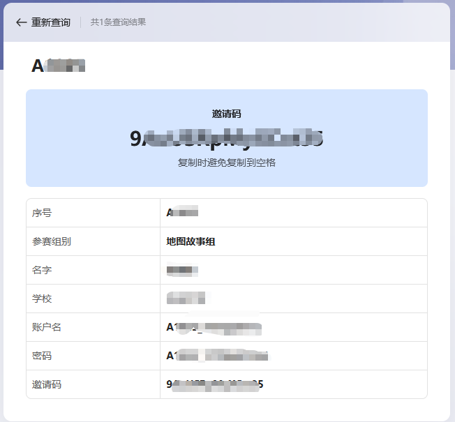 输入个人手机号码,查询邀请码,并复制激活码(手机号码是个人在竞赛系统内注册时候填写的手机号码)邀请码能够让我们免去注册环节,以参赛选手身份快速进入系统,也方便后续的一些工作。此时是可以看到激活后的用户名和密码的,建议一次性复制出“账户名”、“密码”、“激活码”,如果不激活,该账户名和密码是无效的(激活码复制时要避免有空格)。