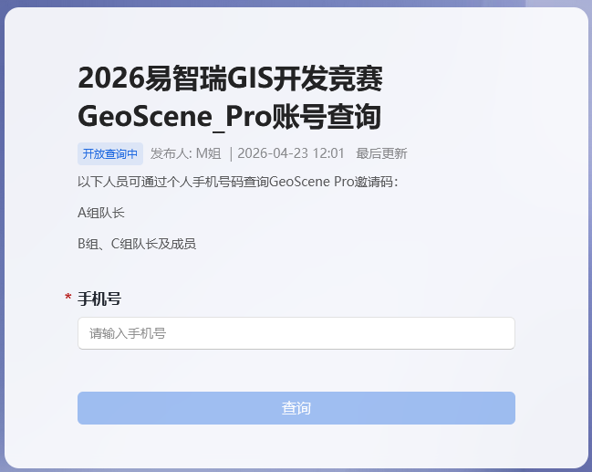 答案:请确认个人是否之前在该网站注册申请过GeoScene Pro,如果已经使用同个手机号码注册过该网站,则无法激活竞赛账号。如之前注册过,仍在许可有效期内的同学,请抓紧时间申请延期,如软件许可已经过期,请联系相关工作人员,告知账号(可邮件发送到contest@geoscene.cn,也可以直接通过队长QQ联系。告知问题时请报组号和自己注册的个人账号)