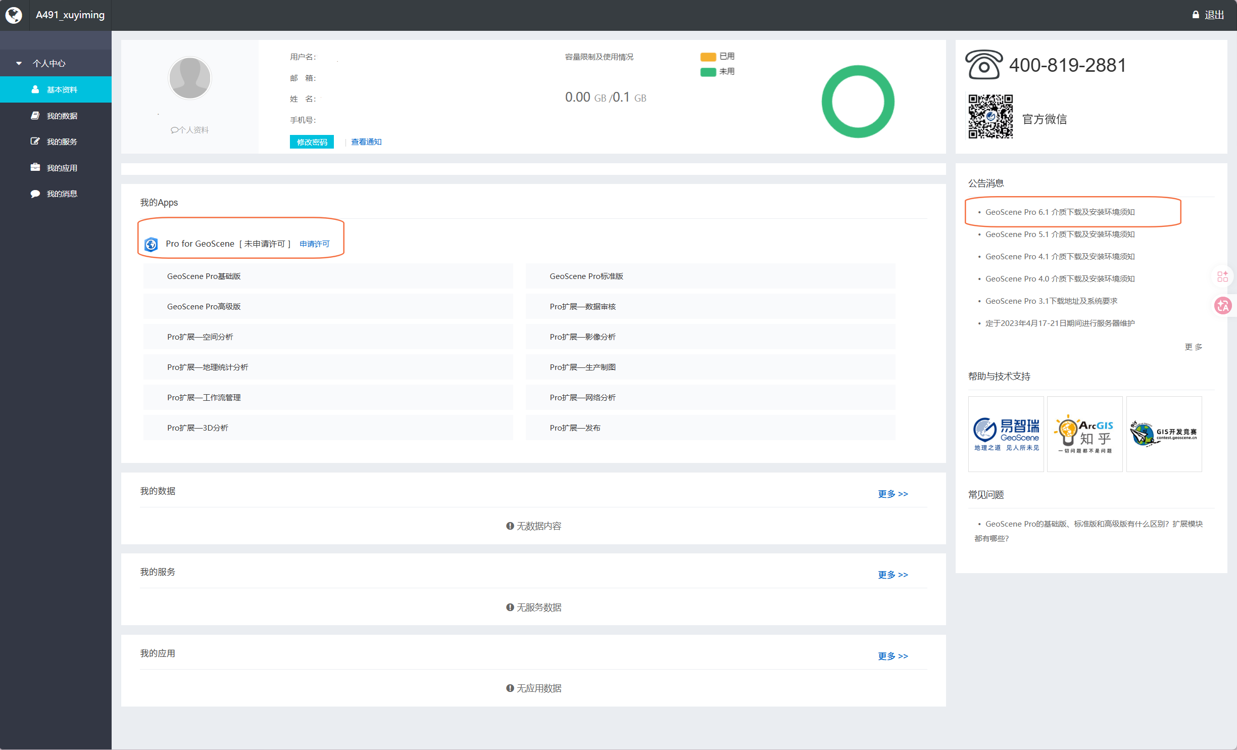 最后,软件安装介质下载地址和软硬件系统环境要求,在GeoScene试用中心消息中心内可以找到(建议大家一定要先看基本环境配置需求,大部分非正常问题都属于系统设备不适配,如果4.1不适配,可以看一下3.1的是否适配)。